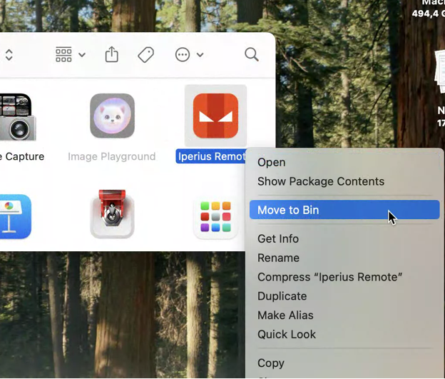 Unter macOS müssen Sie die Iperius Remote-App aus dem Anwendungsbereich in den Papierkorb verschieben: