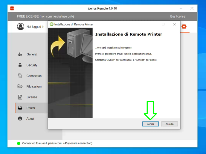 Mit Iperius Remote hingegen können Sie von überall aus eine Verbindung herstellen, ohne irgendetwas auf der Firewall oder im Unternehmensnetzwerk konfigurieren zu müssen. Sie können den Remote-Druck aktivieren, indem Sie einfach einen bestimmten Treiber installieren (der vom Programm automatisch heruntergeladen und installiert wird) und jedes Mal, wenn Sie ein Dokument oder ein Projekt drucken möchten, den Iperius Remote-Drucker auswählen.