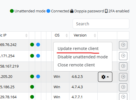 In „Computers“ ist es außerdem möglich, Iperius Remote Clients aus der Ferne zu aktualisieren, sowie den unbeaufsichtigten Zugriff zu deaktivieren oder die Anwendung zu beenden: