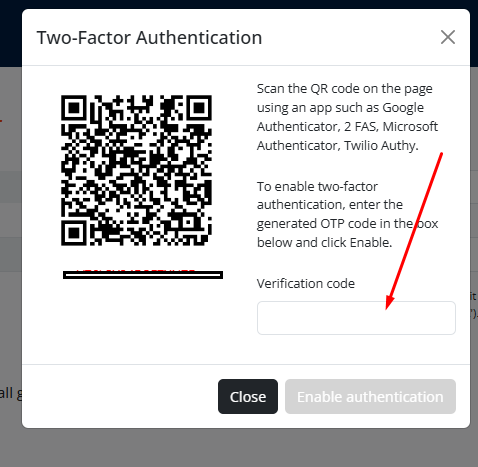 Wie bereits erwähnt, benötigen Sie eine Anwendung, die den QR-Code scannt und einen temporären Code generiert, der in das unten stehende Feld eingegeben werden muss: